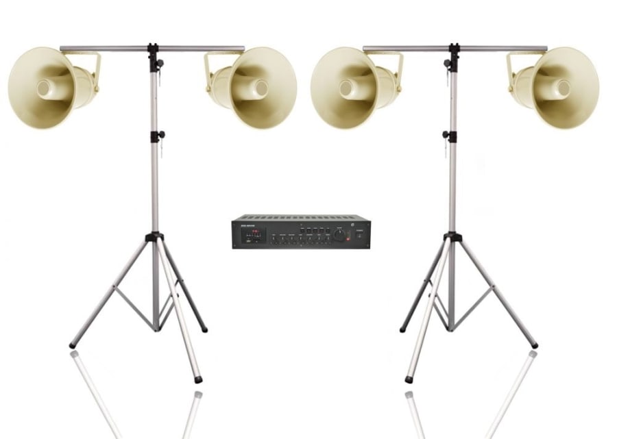 Hire our outdoor event PA system, if you are having a fete, sports day, charity run, and need to be heard. Comes complete with 8 weatherproof horn speakers that are suitable for outdoor use. The mixer amplifier is a robust and has integrated Bluetooth functionality, microphone input and other inputs for Ipod, MP3 player .