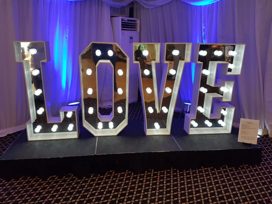 Ideal for weddings, anniversaries and birthdays, these stunning giant love letters feature 4 individual letters, lit up with a crisp white light. Perfect as a backdrop decoration, these letters stand 4 foot high and feature a mirrored back to add to the sparkle and glamour. The