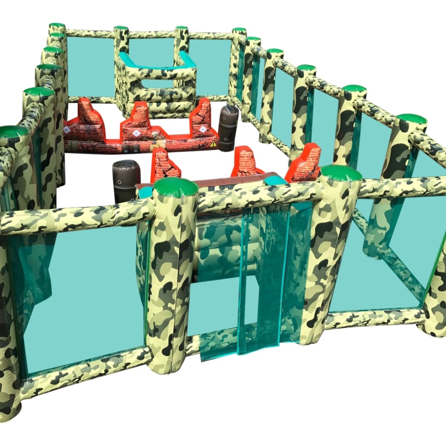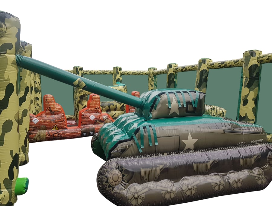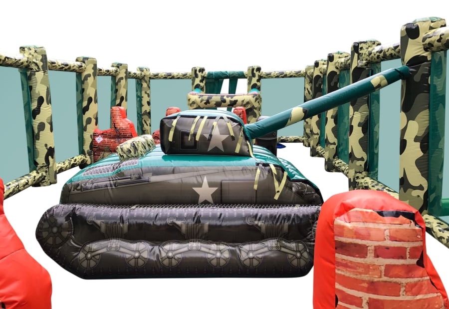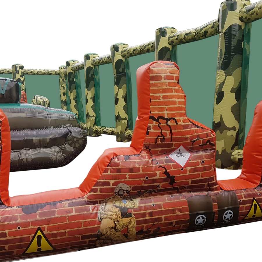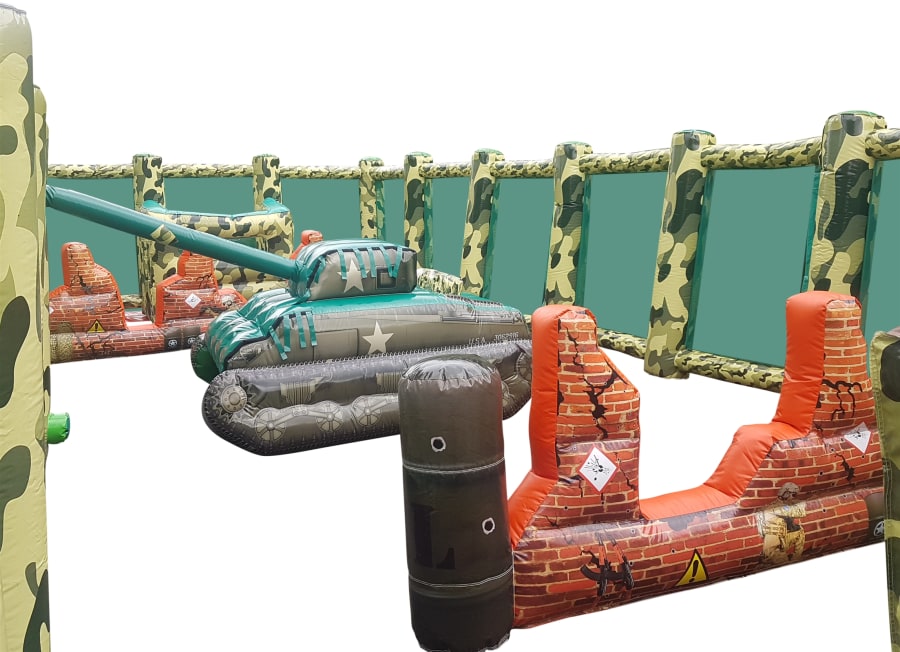 - A huge 50ft x 20ft Inflatable arena it features inflatable walls, bunkers, obstacles and even an inflatable tank