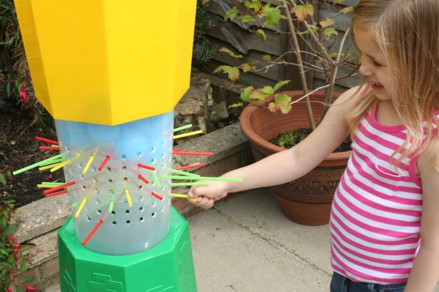 Our Giant KerPlunk is a truly giant version of the popular marble dropping table top game standing 120cm tall. Easy to set up and play anywhere: simply slot together the turret sections, insert the straws randomly, add the balls and you're ready. A fantastically versatile game that is perfect for use inside or outdoors. This attractive and colourful tower is a perfect addition to any gathering and will be a hit with both adults and children alike.